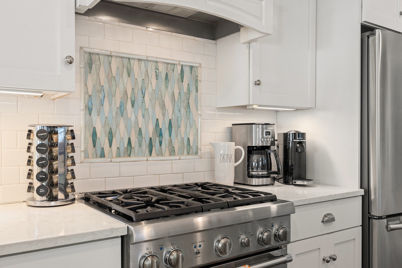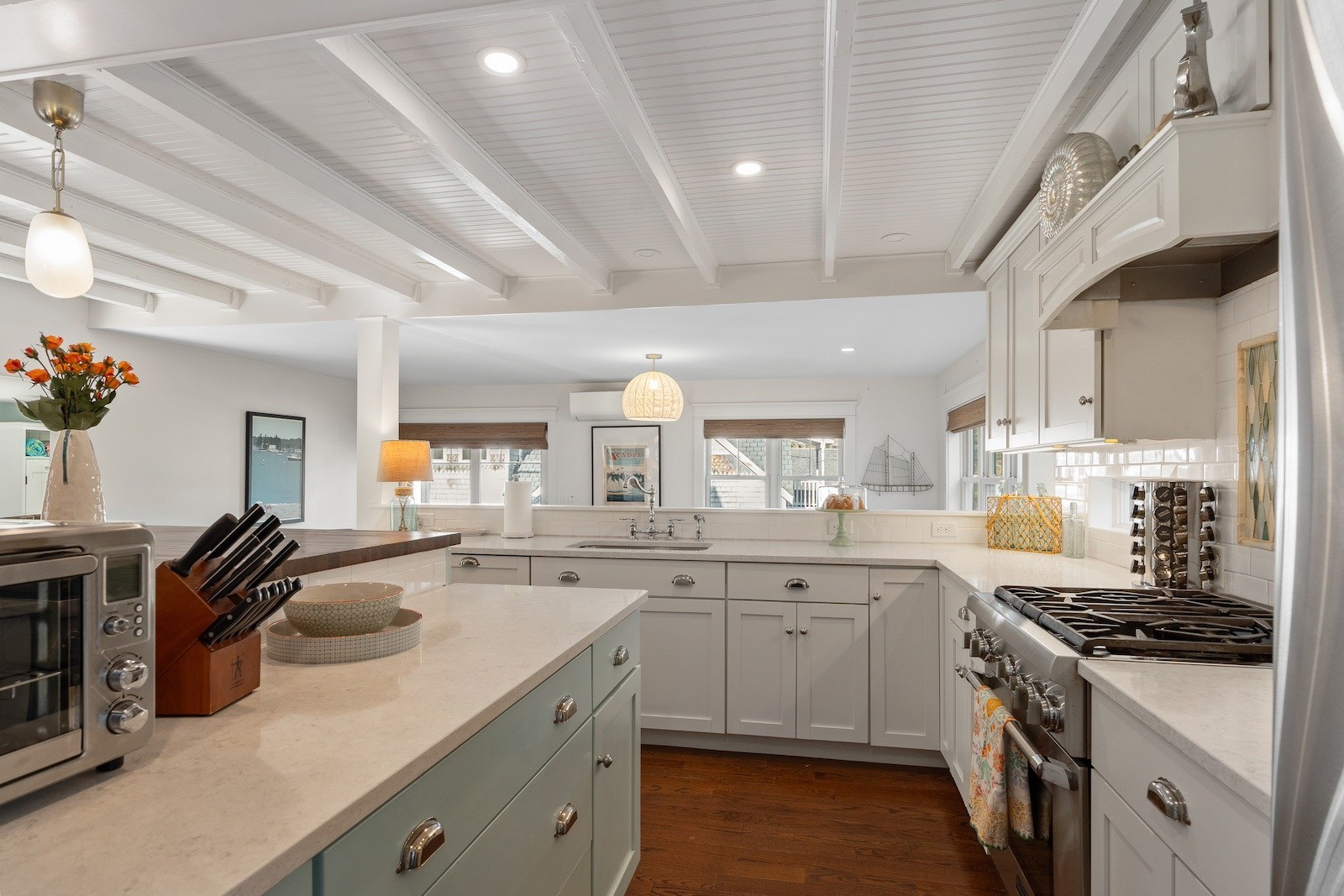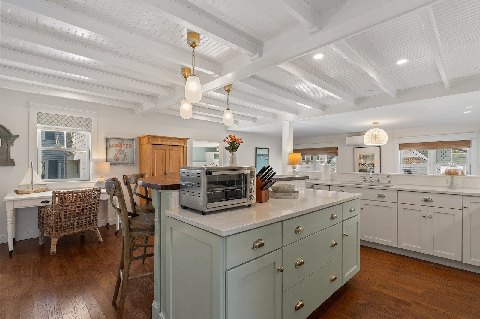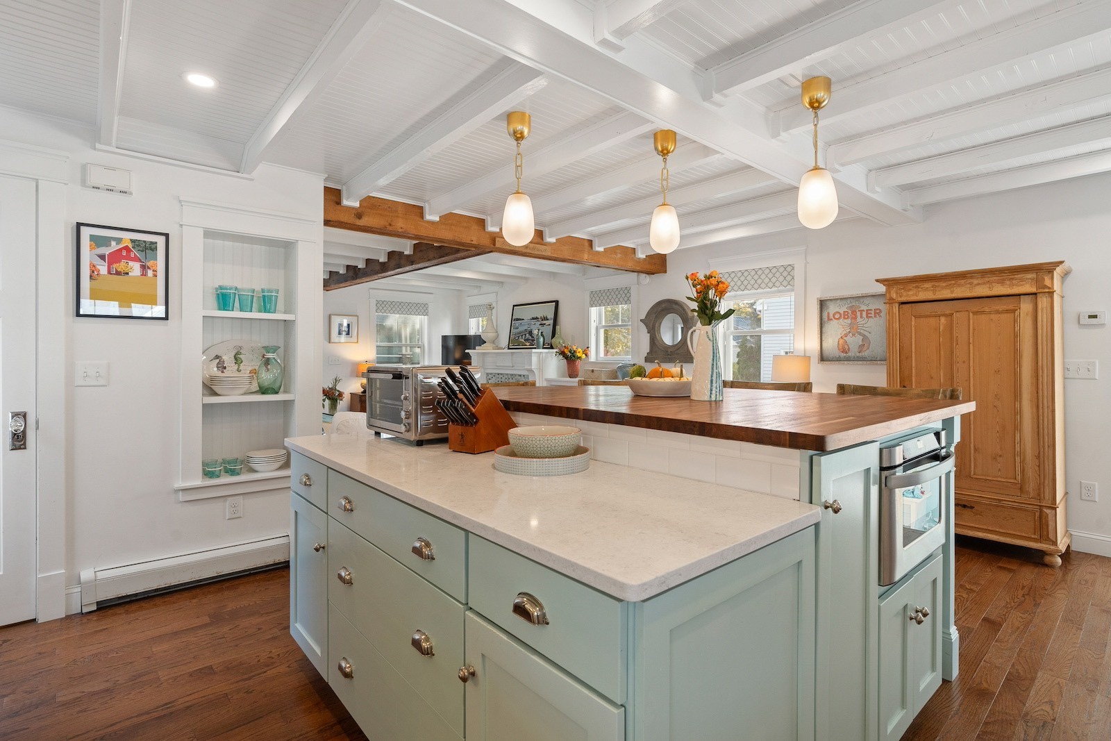White and aqua cabinetry paired with quartz countertops and a polished mahogany butcher block island
